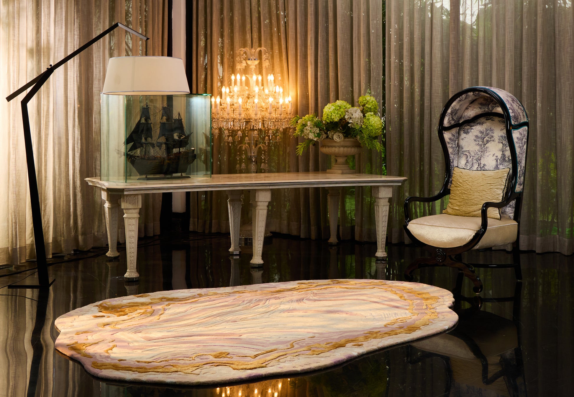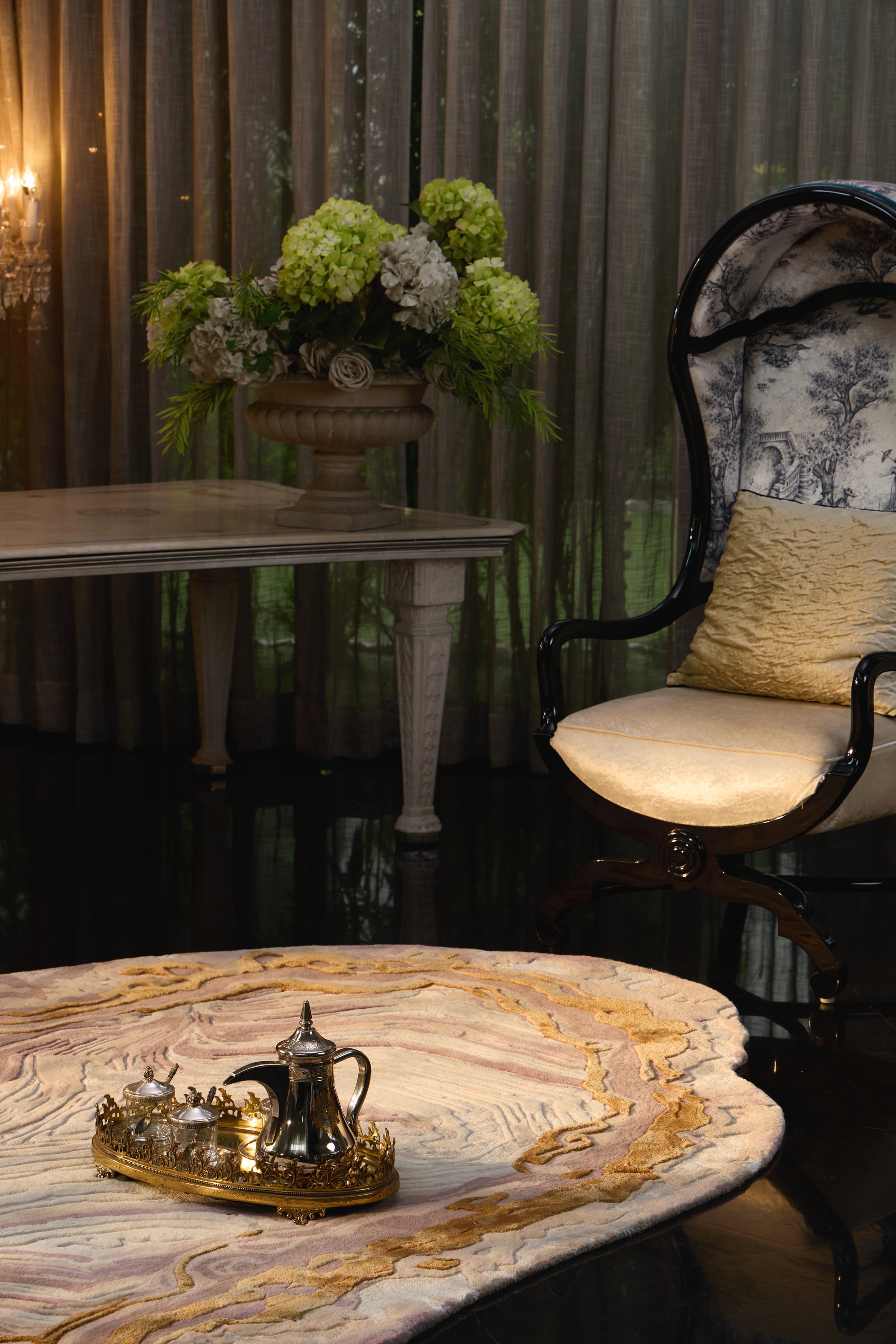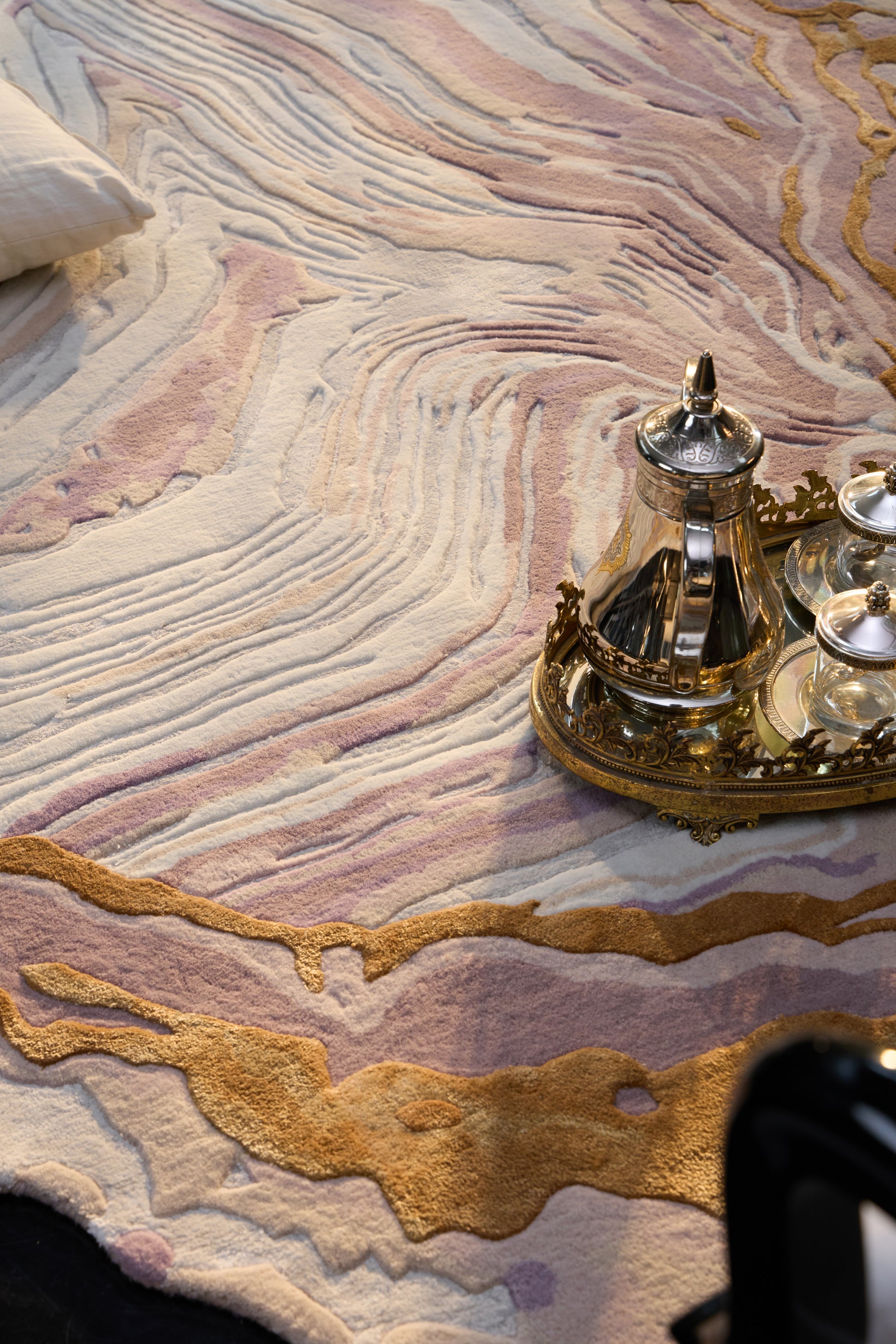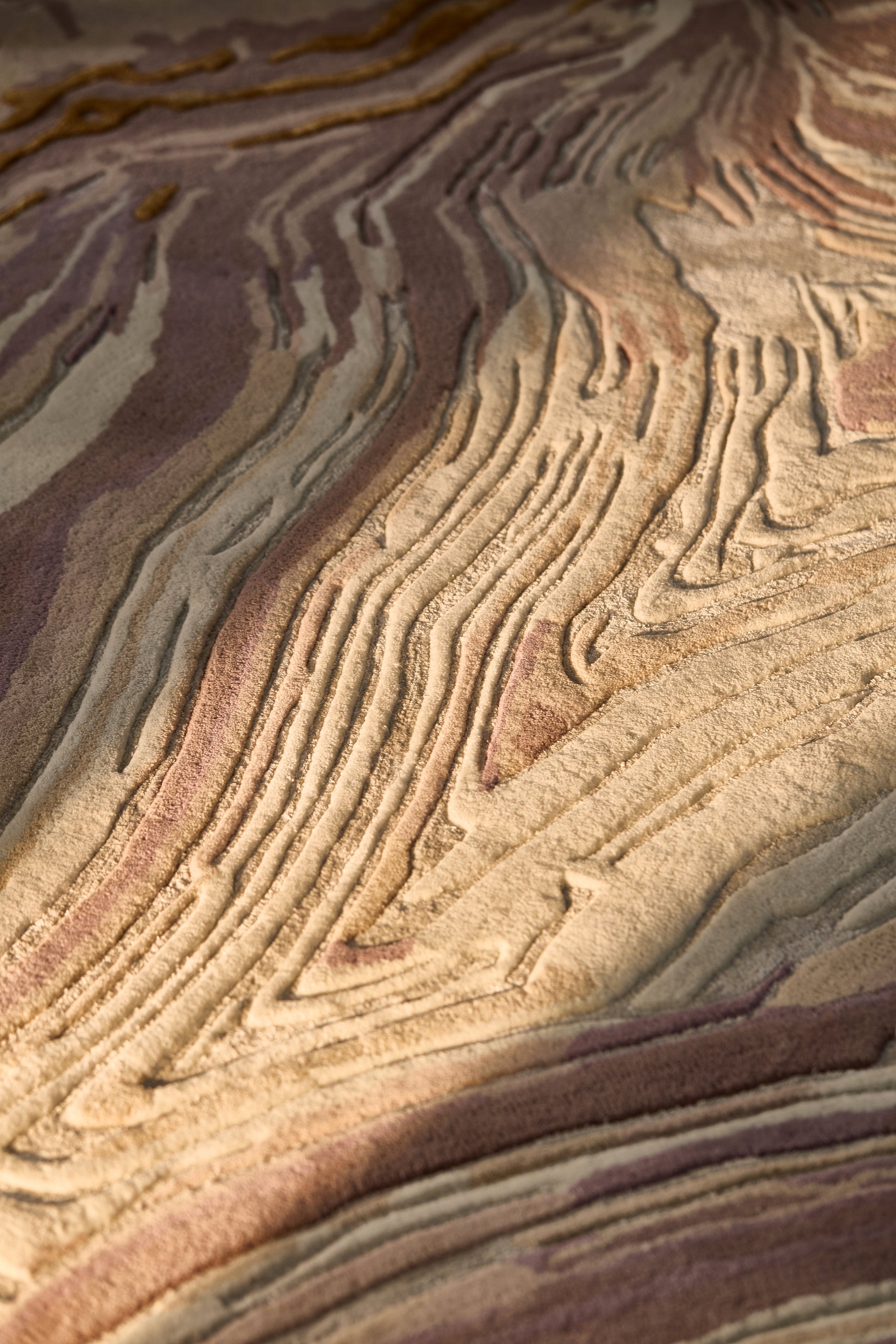 Fior showcases marble-like textures that flow in organic layers, softened by varying pile heights to create a sense of movement and depth. Golden accents shimmer across the surface, catching light like veins of precious ore — a perfect balance of refined elegance and raw, natural beauty.